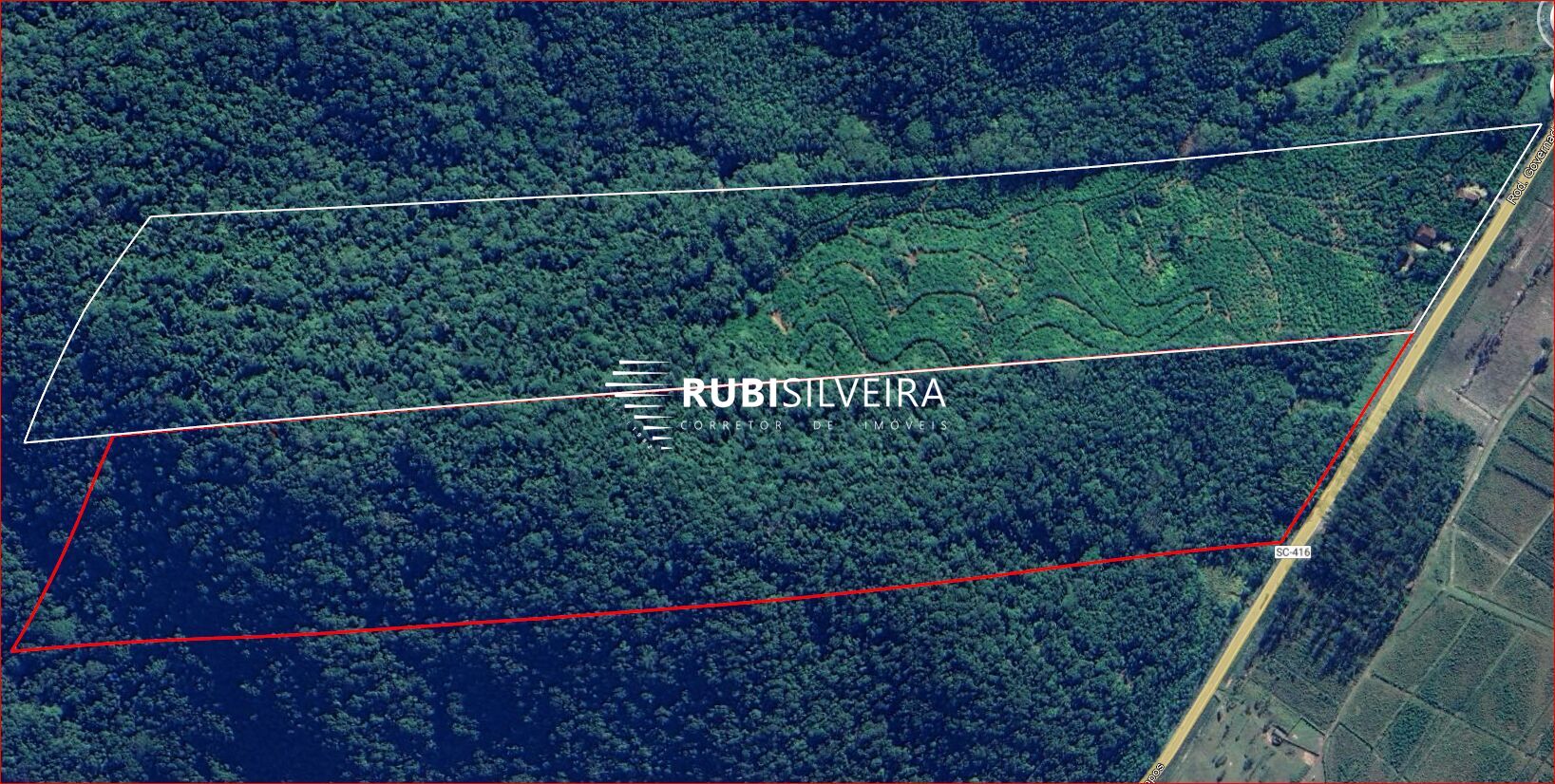 O terreno possui 507 metros de frente para a SC-416, o que proporciona acesso facilitado, ampla pista de aceleração e excelente entrada e saída para caminhões.